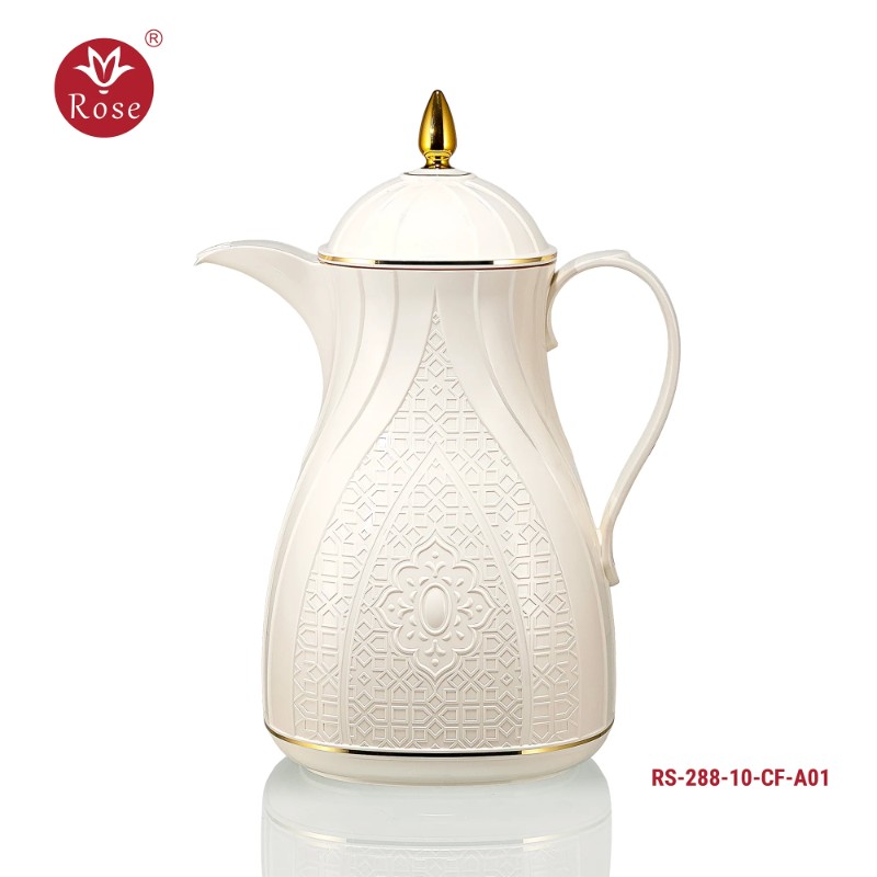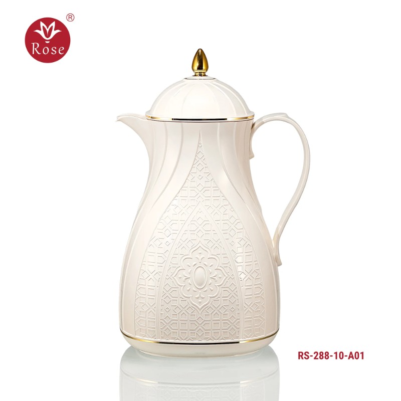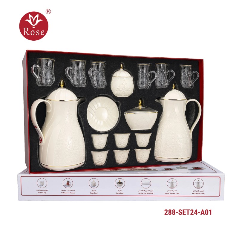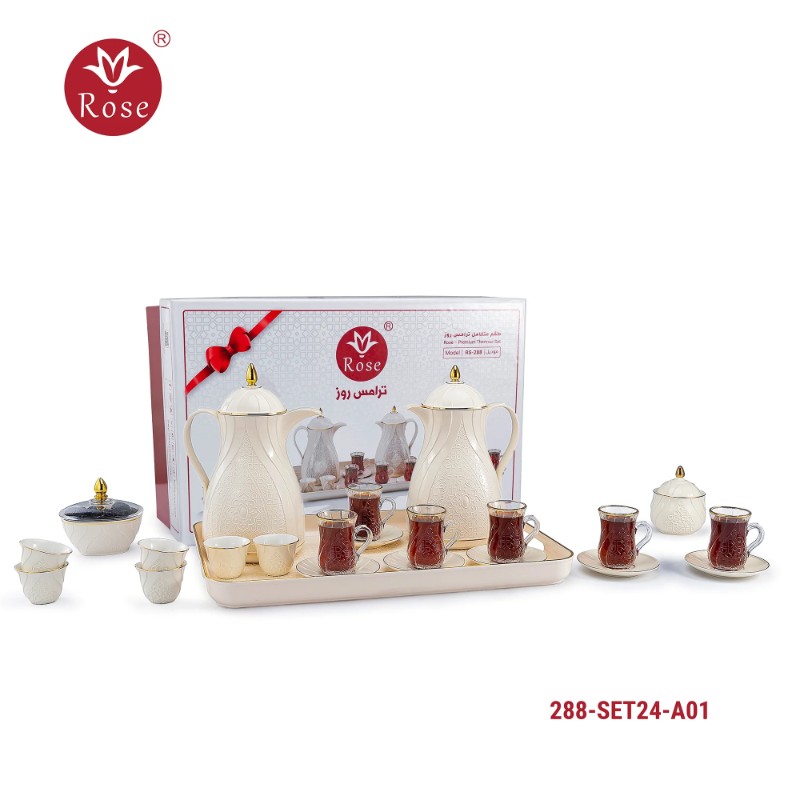 Rose Thermos Complete Set Model: 624-SET24 in a luxurious box containing: Tea Thermos 1-Litre + Coffee Thermos 1-Litre + 6-piece Coffee Cup + 6 Istkana Cup + 6 Saucers + Dates Bowl + Serving Tray 53*35.