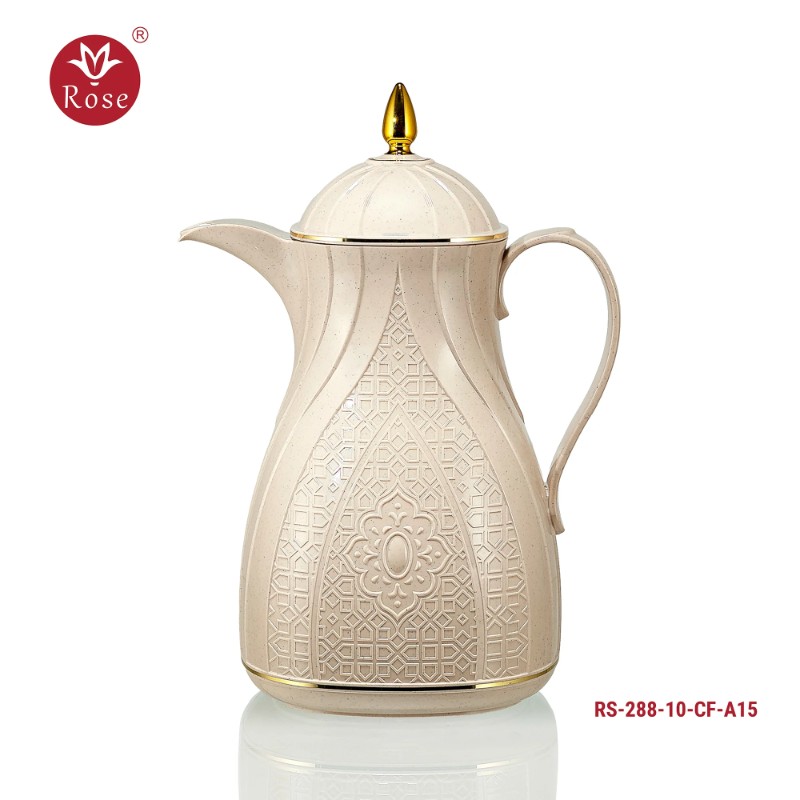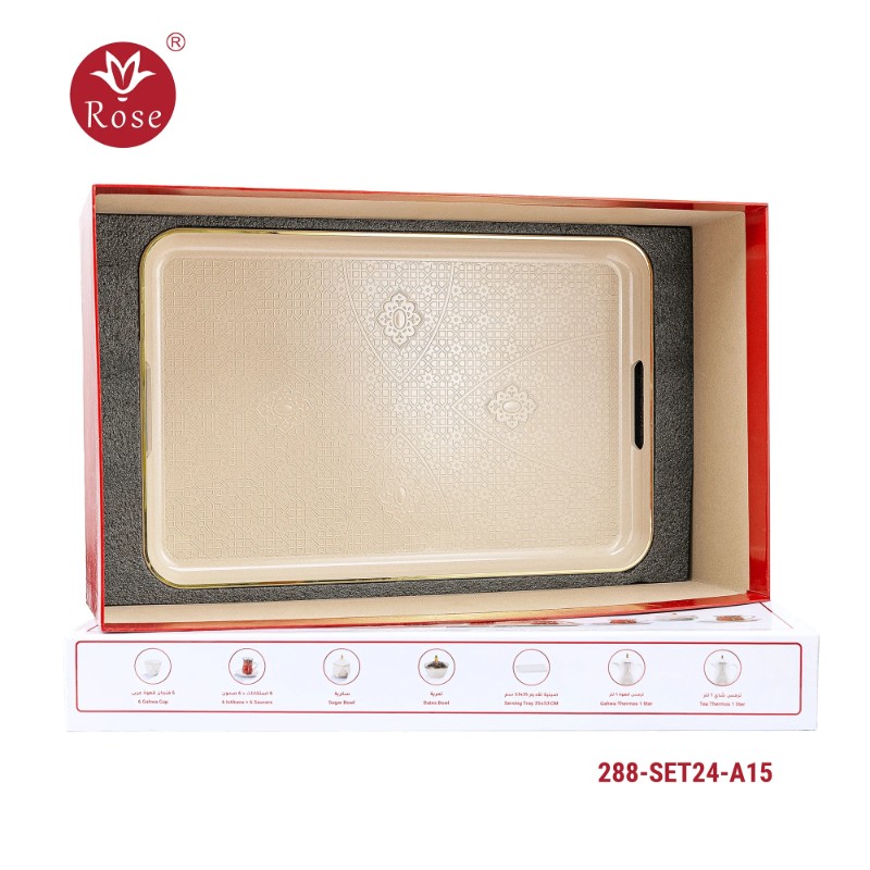 Rose Thermos Complete Set Model: 288-SET24 in a luxurious box containing: Tea Thermos 1-Litre + Coffee Thermos 1-Litre + 6-piece Coffee Cup + 6 Istkana Cup + 6 Saucers + Dates Bowl + Serving Tray 53*35.