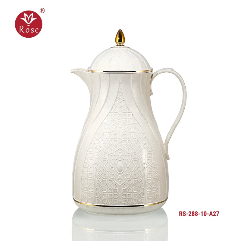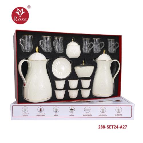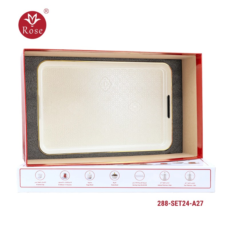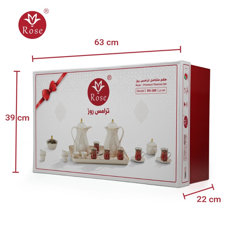 Rose Thermos Complete Set Model: 288-SET24 in a luxurious box containing: Tea Thermos 1-Litre + Coffee Thermos 1-Litre + 6-piece Coffee Cup + 6 Istkana Cup + 6 Saucers + Dates Bowl + Serving Tray 53*35.