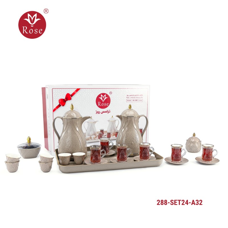 Rose Thermos Complete Set Model: 288-SET24 in a luxurious box containing: Tea Thermos 1-Litre + Coffee Thermos 1-Litre + 6-piece Coffee Cup + 6 Istkana Cup + 6 Saucers + Dates Bowl + Serving Tray 53*35.