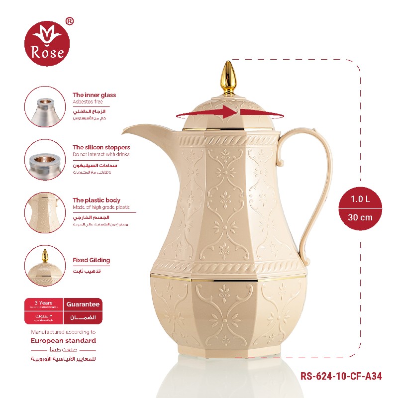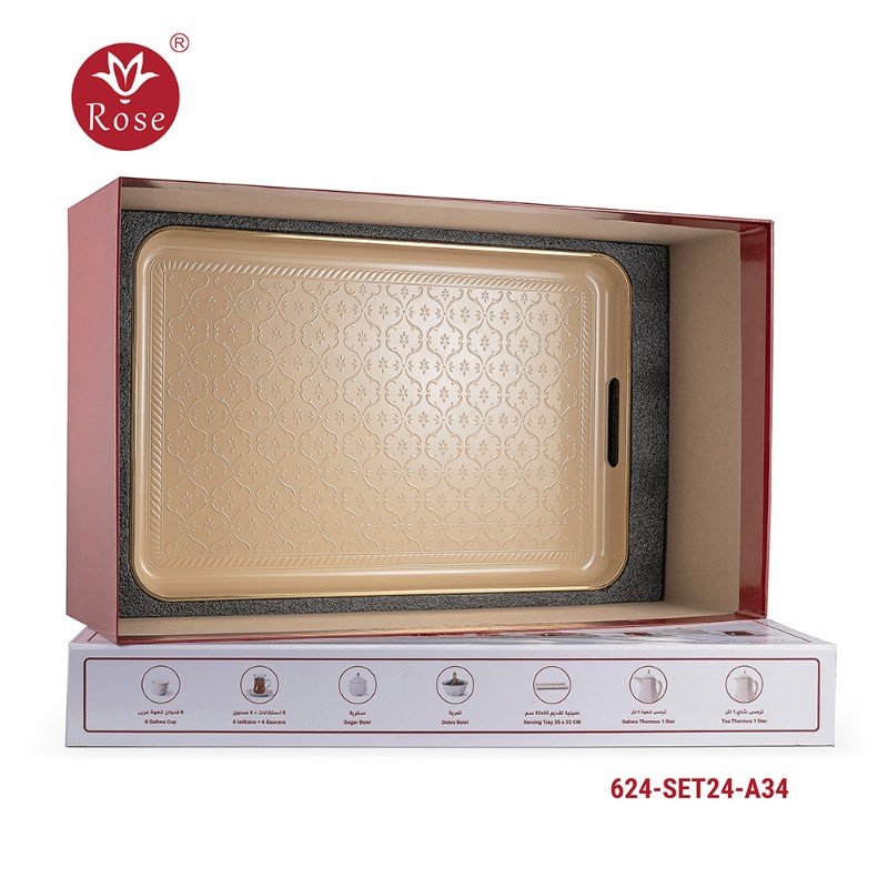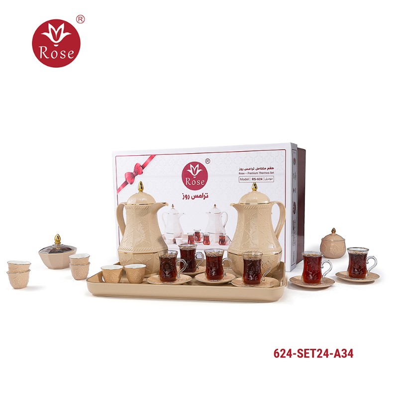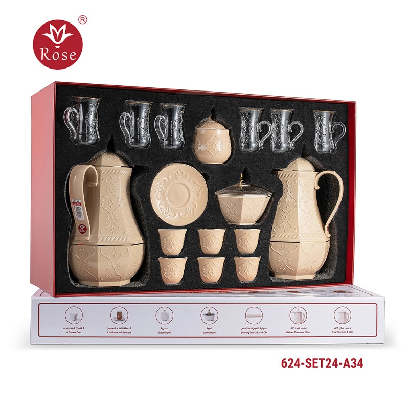 Rose Thermos Complete Set Model: 624-SET24 in a luxurious box containing: Tea Thermos 1-Litre + Coffee Thermos 1-Litre + 6-piece Coffee Cup + 6 Istkana Cup + 6 Saucers + Dates Bowl + Serving Tray 53*35.