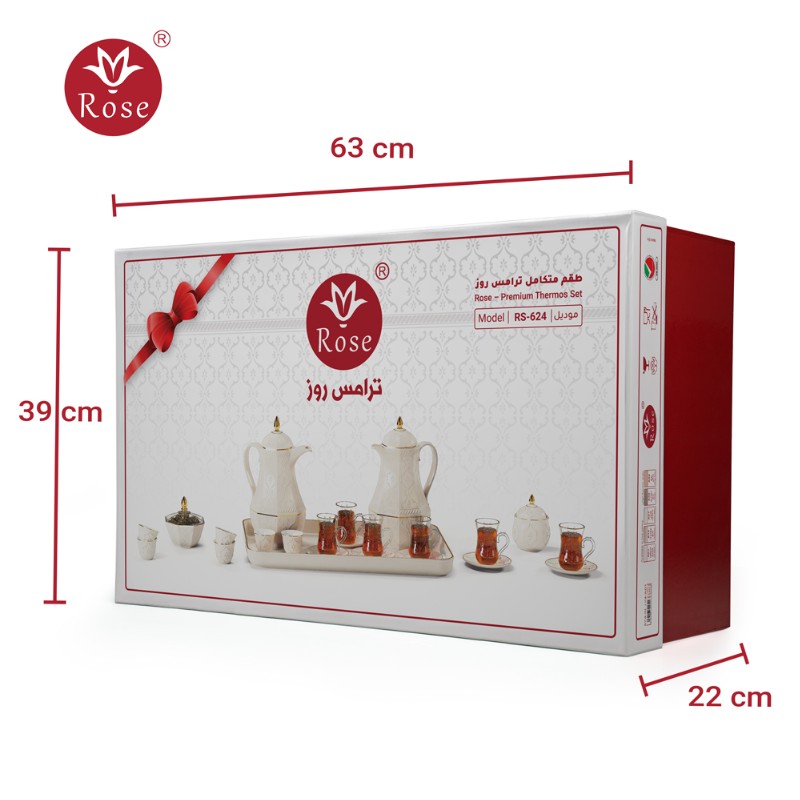 طقم ترامس روز المتكامل Model: 624-SET24 في بوكس فخم يحتوي على: ترمس شاي 1 لتر + ترمس قهوة 1 لتر + 6 فنجان قهوة عربي + 6 استكانات + 6 صحون + سكرية + تمرية + صينية تقديم بمقاس 53x35 سم