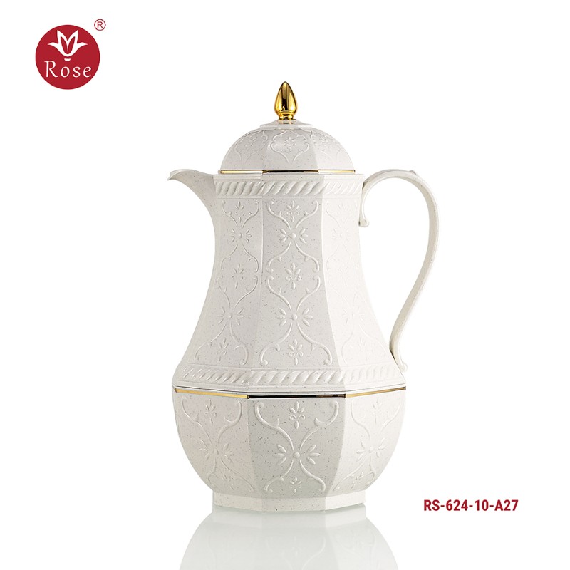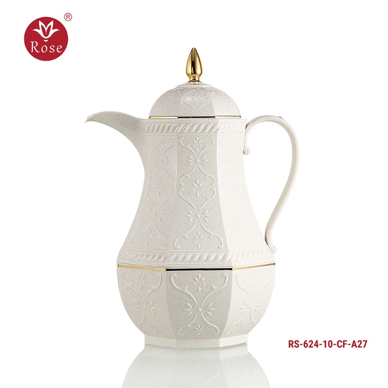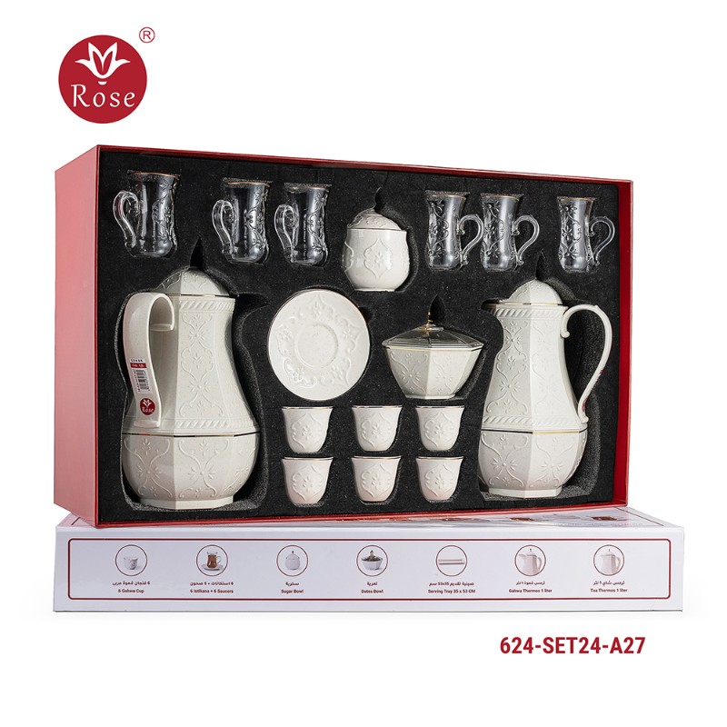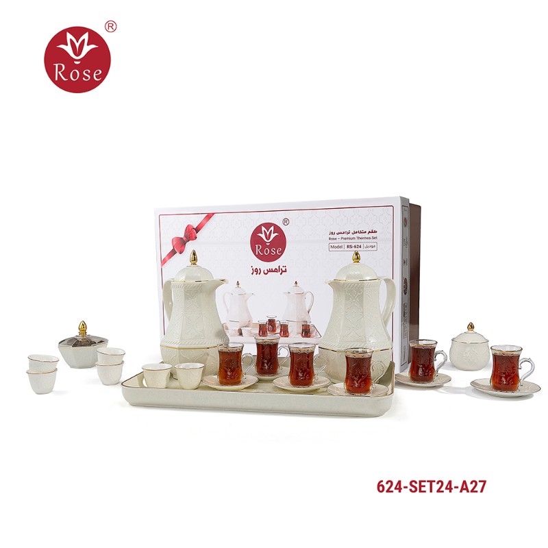 طقم ترامس روز المتكامل Model: 624-SET24 في بوكس فخم يحتوي على: ترمس شاي 1 لتر + ترمس قهوة 1 لتر + 6 فنجان قهوة عربي + 6 استكانات + 6 صحون + سكرية + تمرية + صينية تقديم بمقاس 53x35 سم